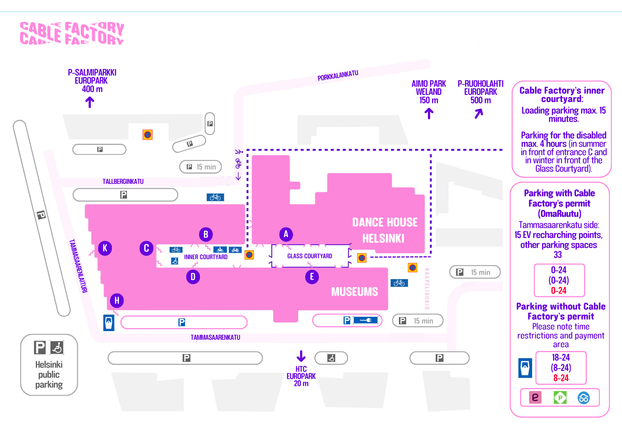 On Tammasaarenkatu next to Cable Factory, there are about 50 parking spaces. Parking to these spaces require a valid parking agreement with Cable Factory and the use of electronic parking permit system. With parking permit, parking is permitted to these spaces every day of the week and any time of day.
