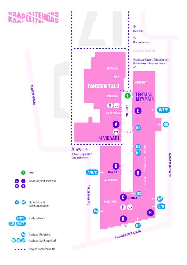 Sisäänkäynnit A- ja E-portaisiin ovat Lasipihan sisällä. Lasipihalta lähtevän ja Baanaksi nimetyn kellarireitin kautta pääsee sisäkautta B-, C- ja D-portaisiin. Lasipihan läpi pääsee Kaapelitehtaan sisäpihalle, josta löytyvät myös sisäänkäynnit B-, C- ja D-portaisiin.