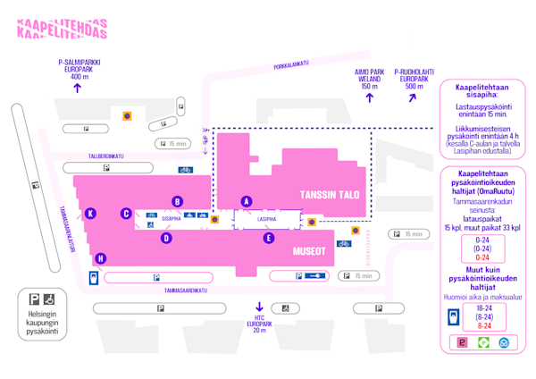 Huom. arkisin ma-pe klo 6-18 nämä pysäköintipaikat ovat varattuja pelkästään Kaapelitehtaan pysäköintioikeuden haltijoille.