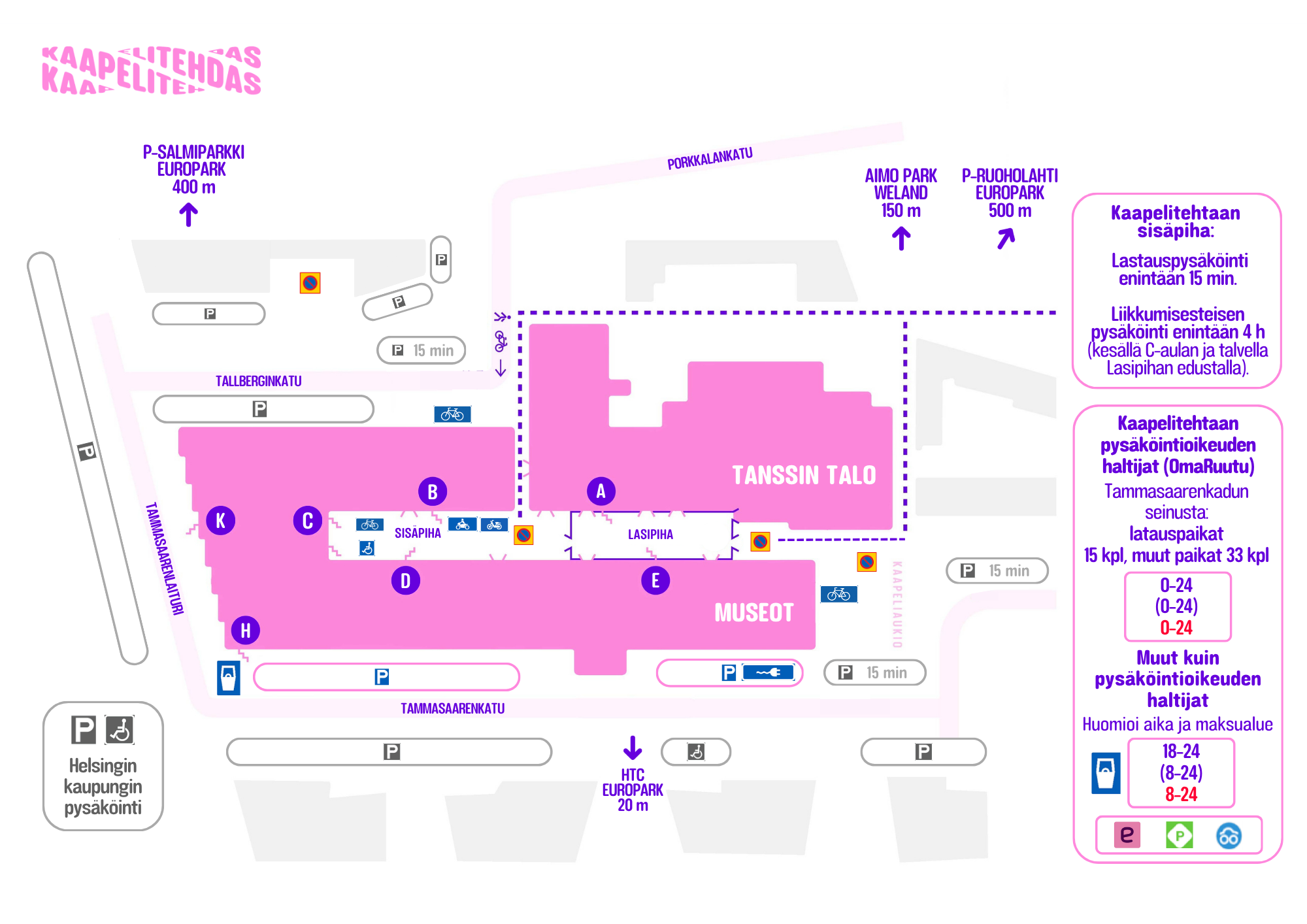 Huom. arkisin ma-pe klo 6-18 nämä pysäköintipaikat ovat varattuja pelkästään Kaapelitehtaan pysäköintioikeuden haltijoille.