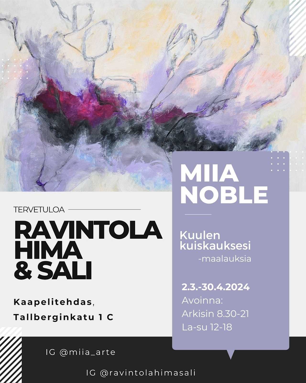 Miia Noble maalaa pehmeitä abstrakteja teoksia, joissa kontrastisuus näyttäytyy vaaleana keveytenä ja varjona tai pakahduttavana värikylläisyytenä. Kuulen kuiskauksesi -taidenäyttely on esillä ravintola Hima & Salissa maalis-huhtikuun ajan. Kaikki näyttelyn teokset ovat myynnissä ja niitä voi tiedustella taiteilijalta.