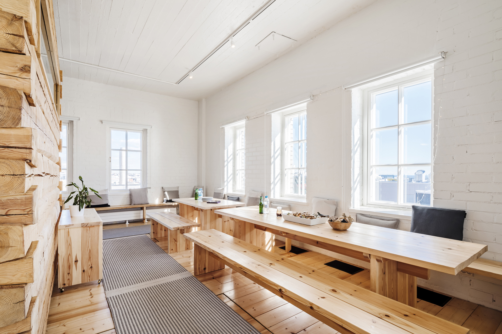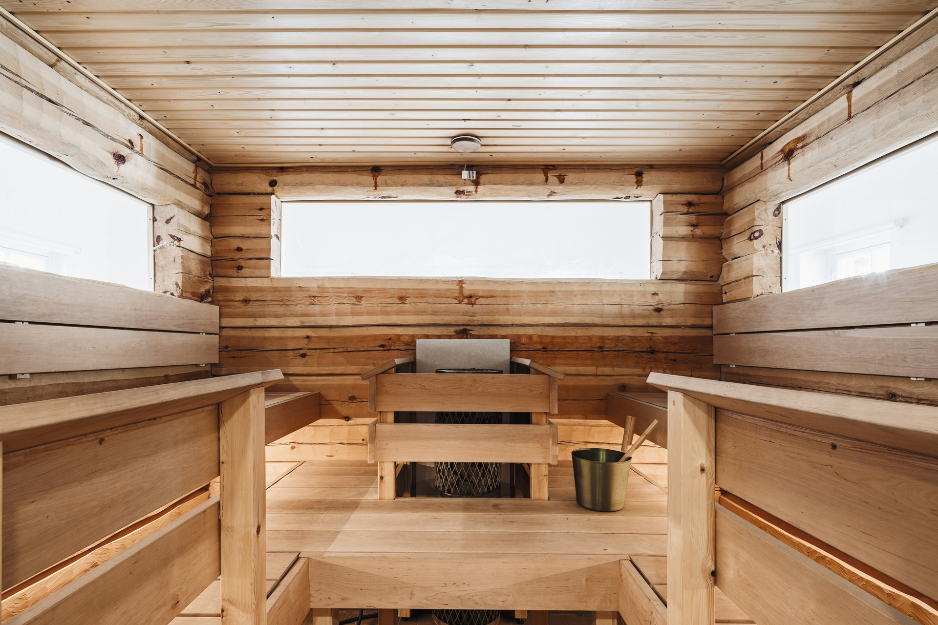 Tämä kattosauna ei jätä ketään kylmäksi. Käsinvuoltuun hirsisaunaan sopii kerralla 8 saunojaa, ja tiloihin mahtuu yhteensä 25 hengen sauna- ja kokousseurueet. Näkymistä voi nauttia sään salliessa myös ulkoterassilla tai kylmyyden yllättäessä katetun terassin puolella, lämmittimien alla.