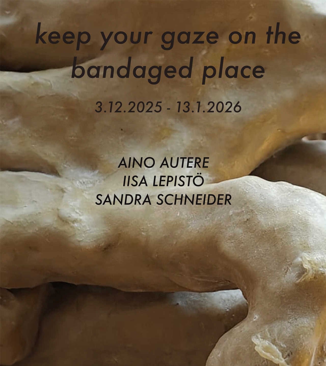 Keep your gaze on the bandaged place tarkastelee kehon kieltä kolmesta eri asennosta käsin. Näyttelyn teokset käsittelevät kehon sisäistä ja kehojen välistä viestintää sekä ruumista muutoksen tilassa.