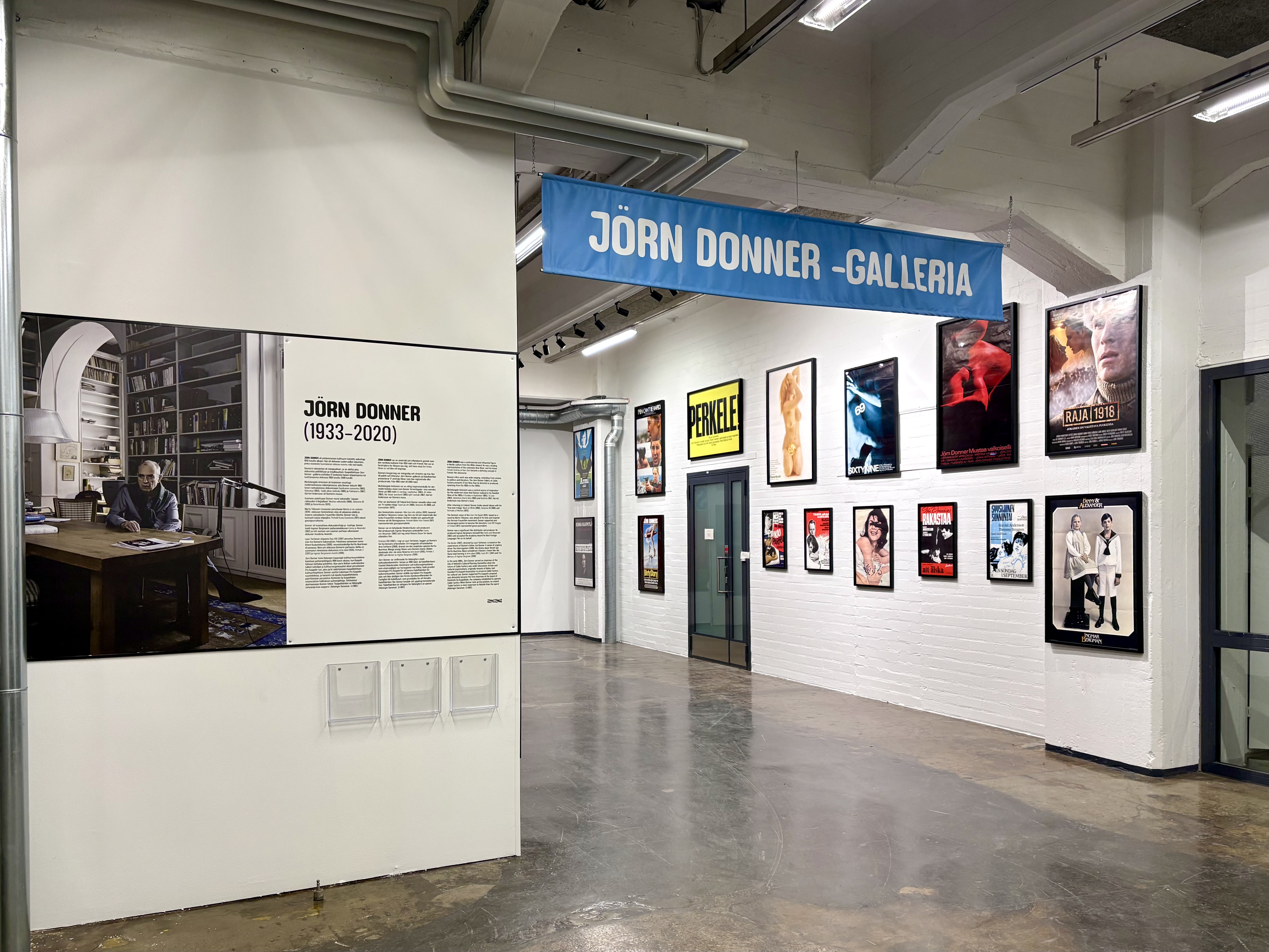 Donnerin elämäntyö oli monipuolinen, ja se ulottui aina elokuvista politiikkaan ja kirjallisuuteen. Jörn Donner -galleria esittelee 12 Donnerin ohjaamaa ja kaksi hänen tuottamaansa elokuvaa, aina 1960-luvulta 2000-luvulle asti, niiden julisteiden kautta sekä Donnerin käyttämän leikkauspöydän.