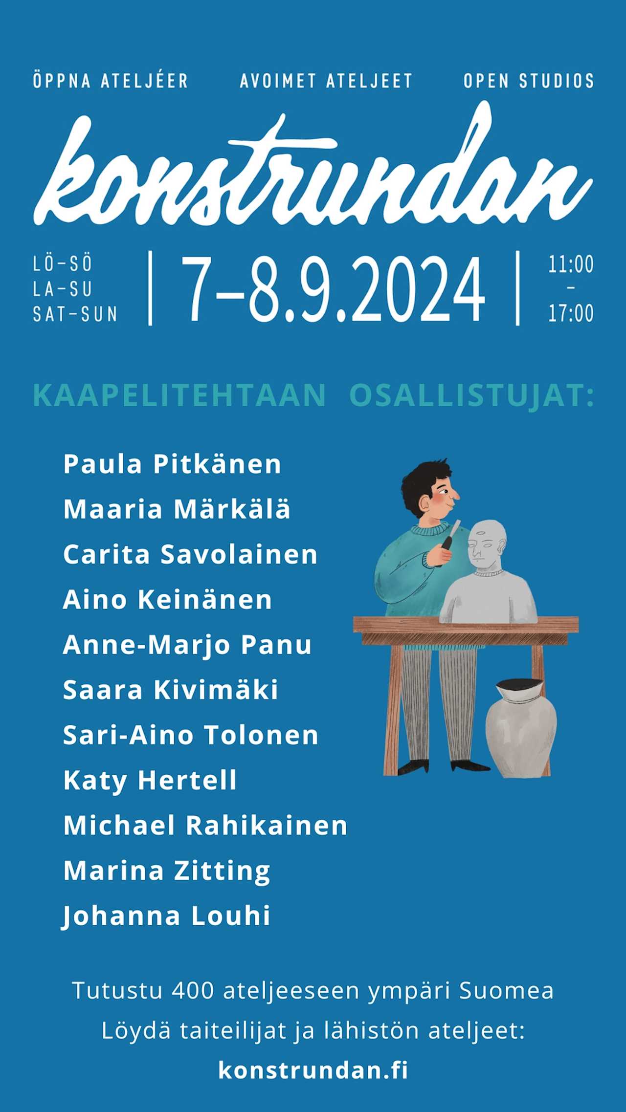 Tervetuloa ihmettelemään, hämmästelemään ja saamaan elämyksiä ja inspiraatiota taiteesta. Konstrundan: Avoimet ateljeet - Open Doors - Öppna Dörrar on avoin ateljee -tapahtuma, jossa taiteen, taidekäsityön ja muotoilun ammattilaiset avaavat työhuoneensa ovet yleisölle.